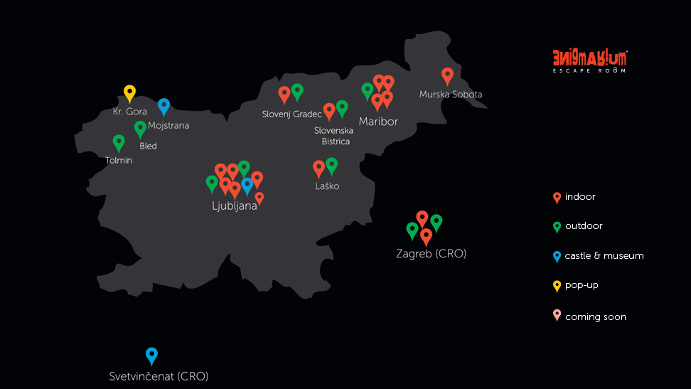 Ljubljana in Maribor (center s 5 igrami = do 30 oseb hkrati), Murska Sobota (1 igra), Laško (1 igra), Slovenj Gradec in Slovenska Bistrica (1 igra) in Zagreb (2 igri).